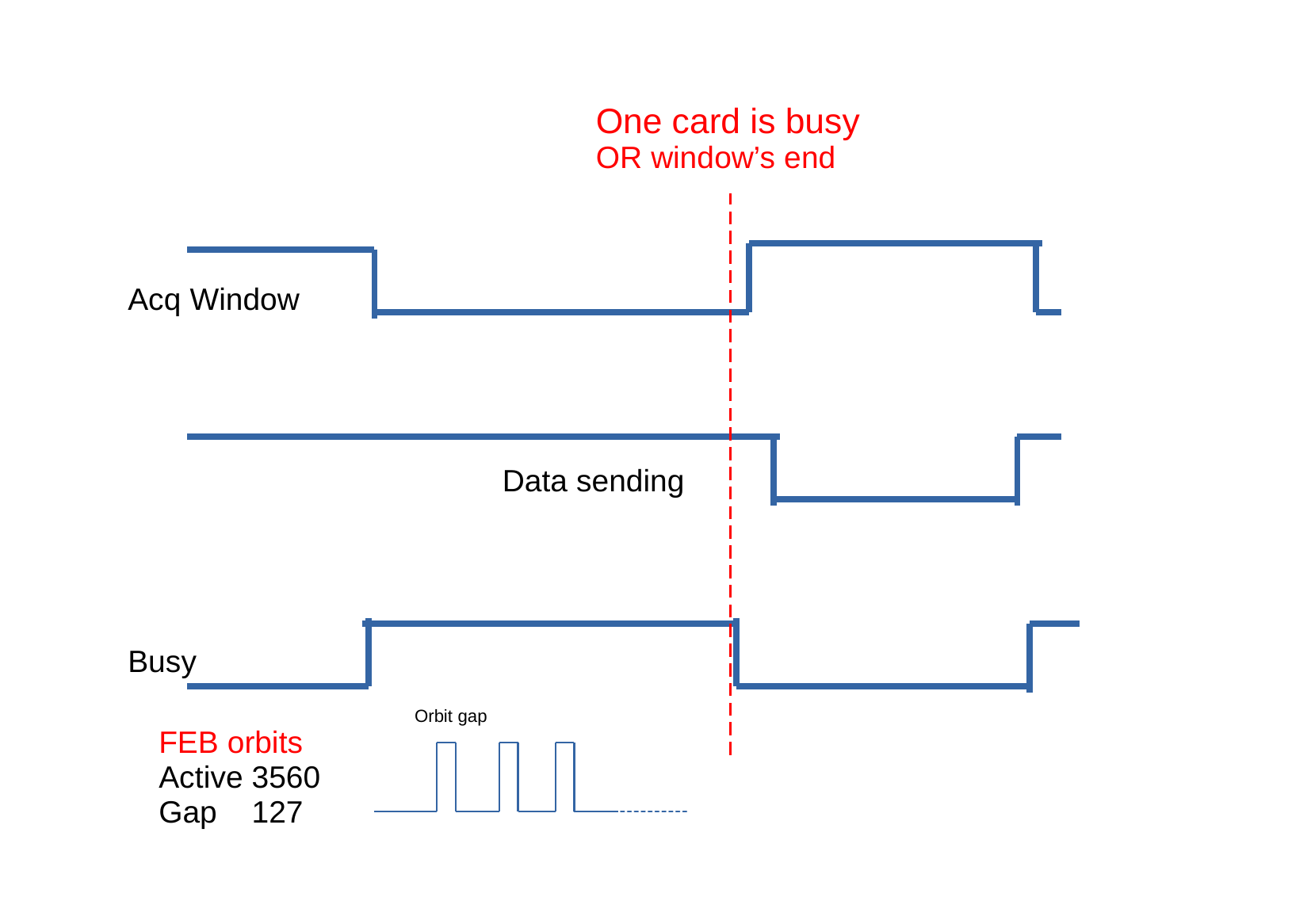 In IDLE state the FC7 is stuck in orbit gap. When the window starts, the FC7 starts 89 s orbits until the window ends (busy or end at fixed time). It then sends the data to the PC via IPBUS.