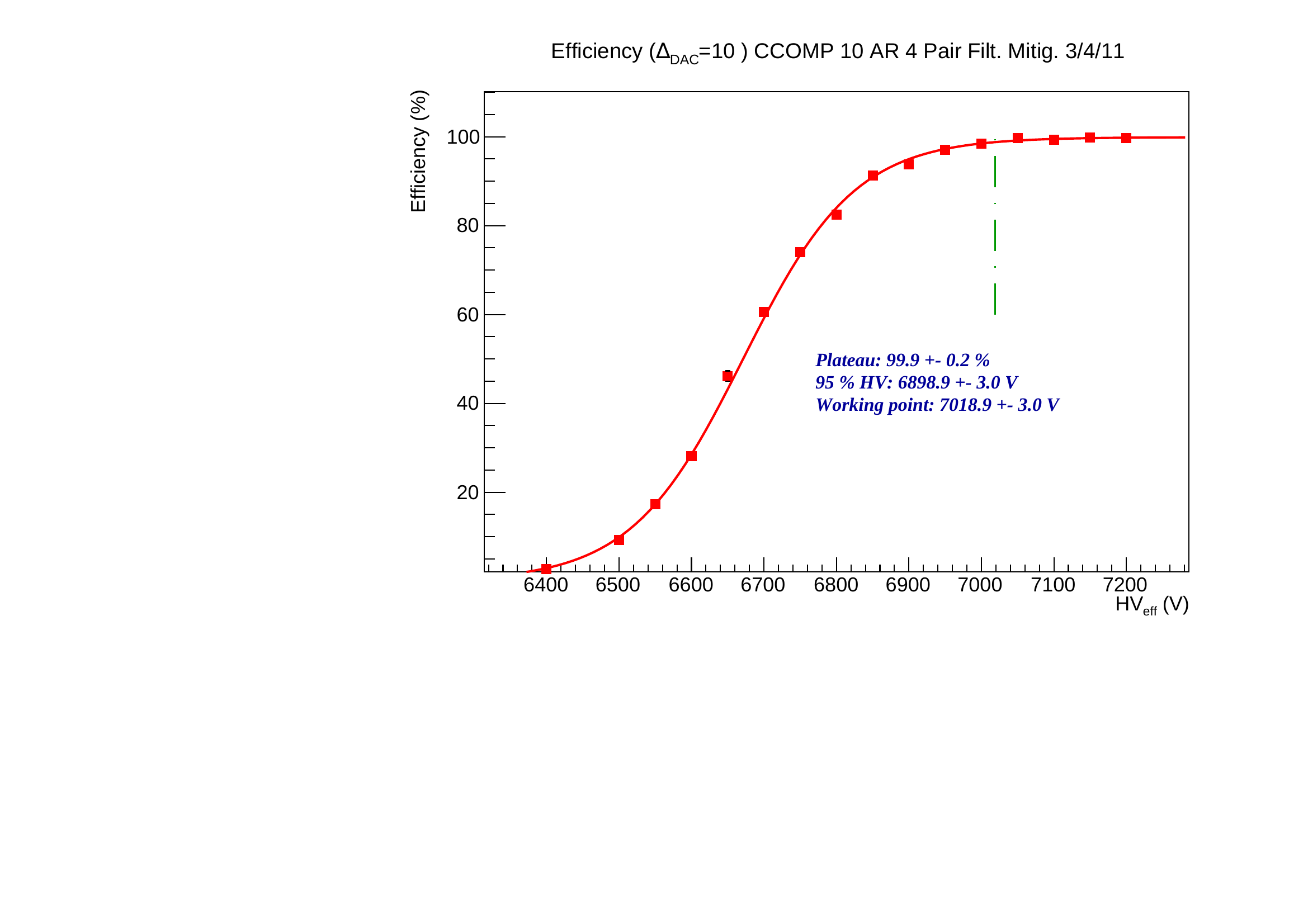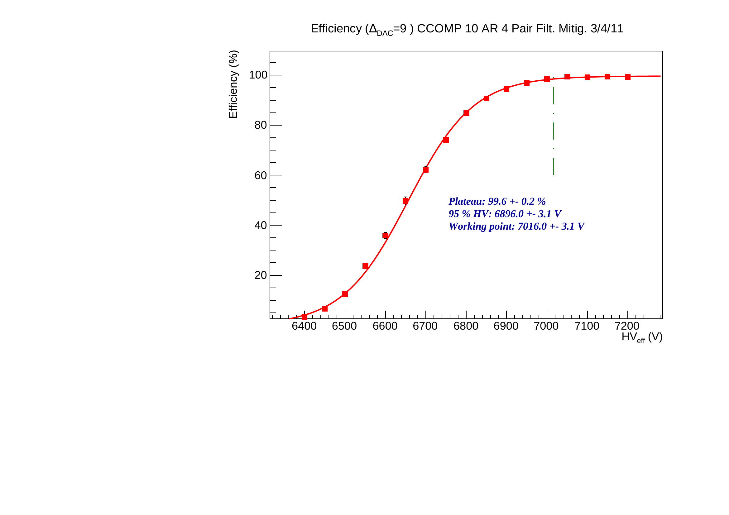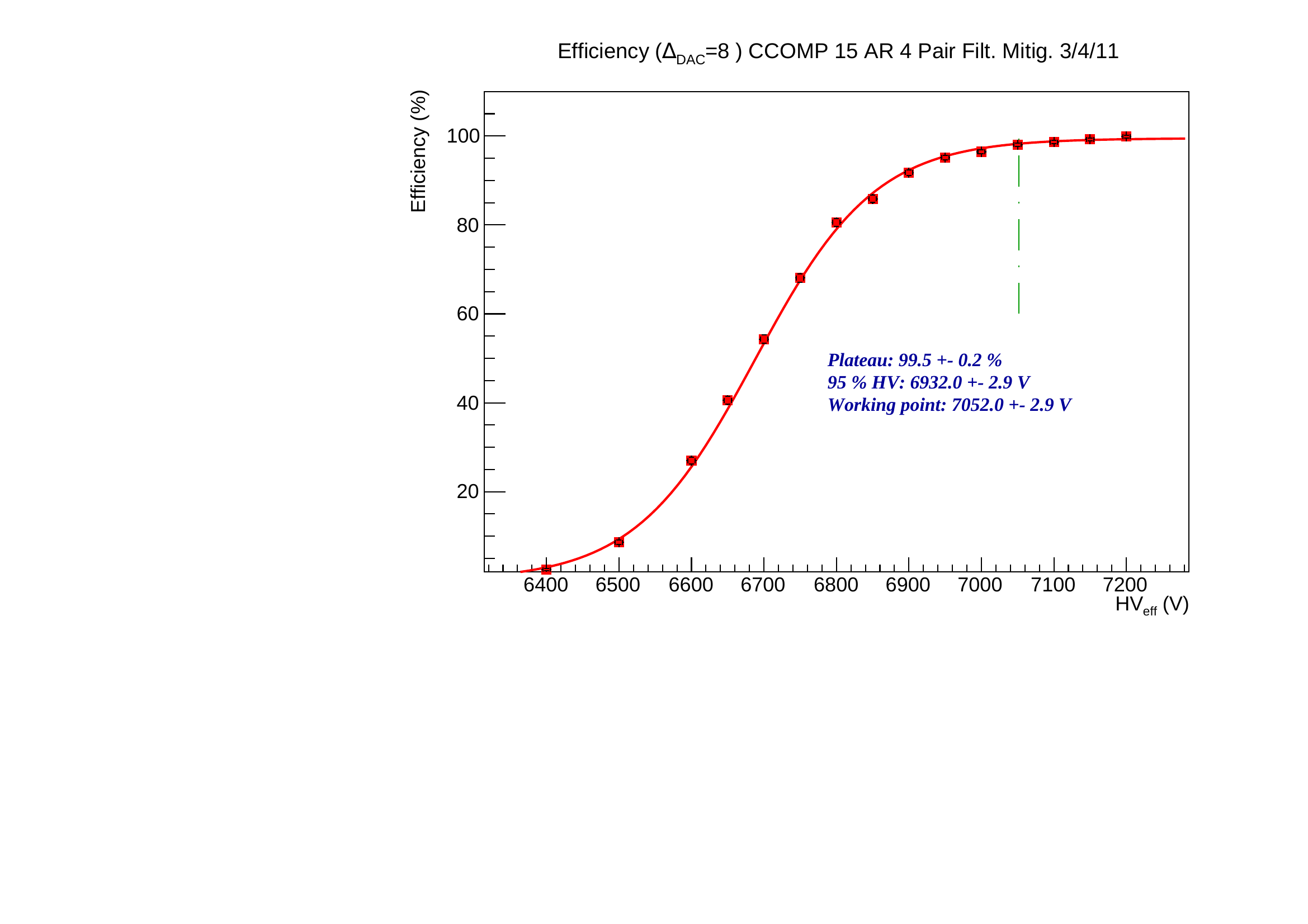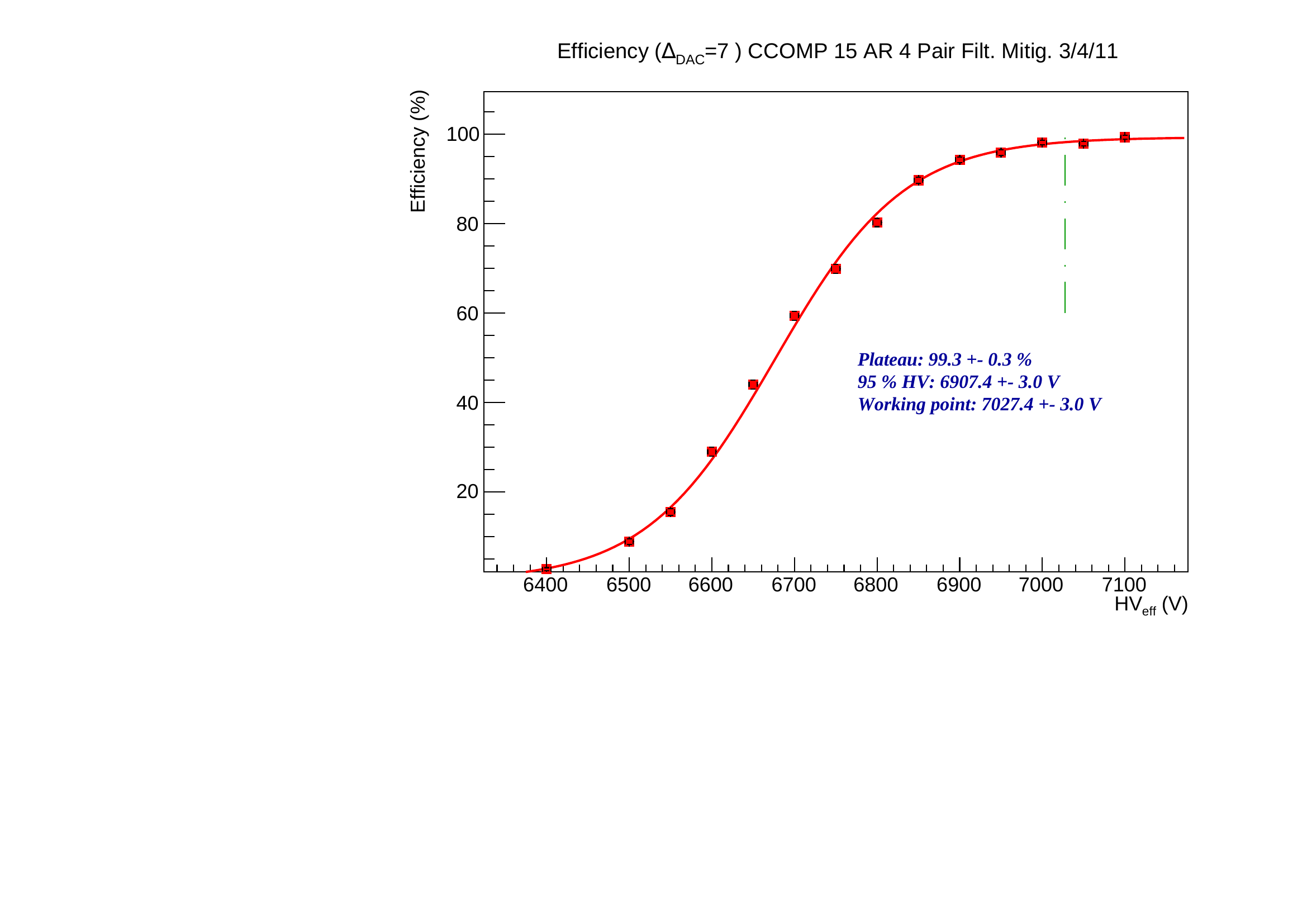 There is also discrepancies in working point up to 15 V between same measurements repeated at different time. It may comes from the P,T correction that may not be valid for large (>10 degrees) variation or from the quality of the fit. It should be use as a systematic error on our working point prediction. A last point is the momentum of the cosmic muon, despite the track selection, is not on the ultra relativistic plateau of the ionization and it may induce a smaller signal and a worsen working point.