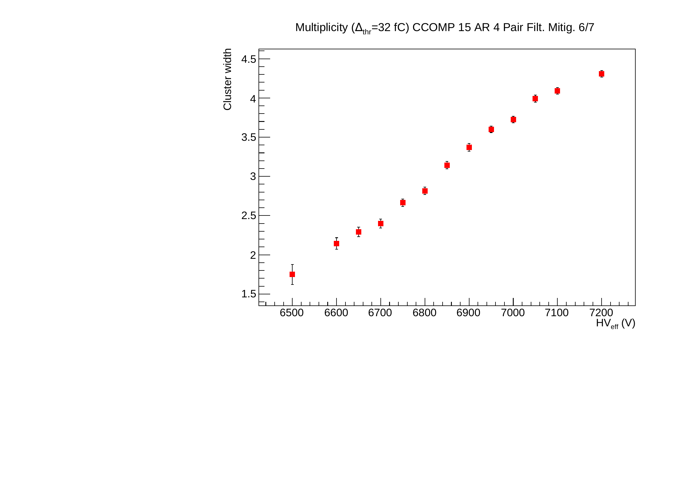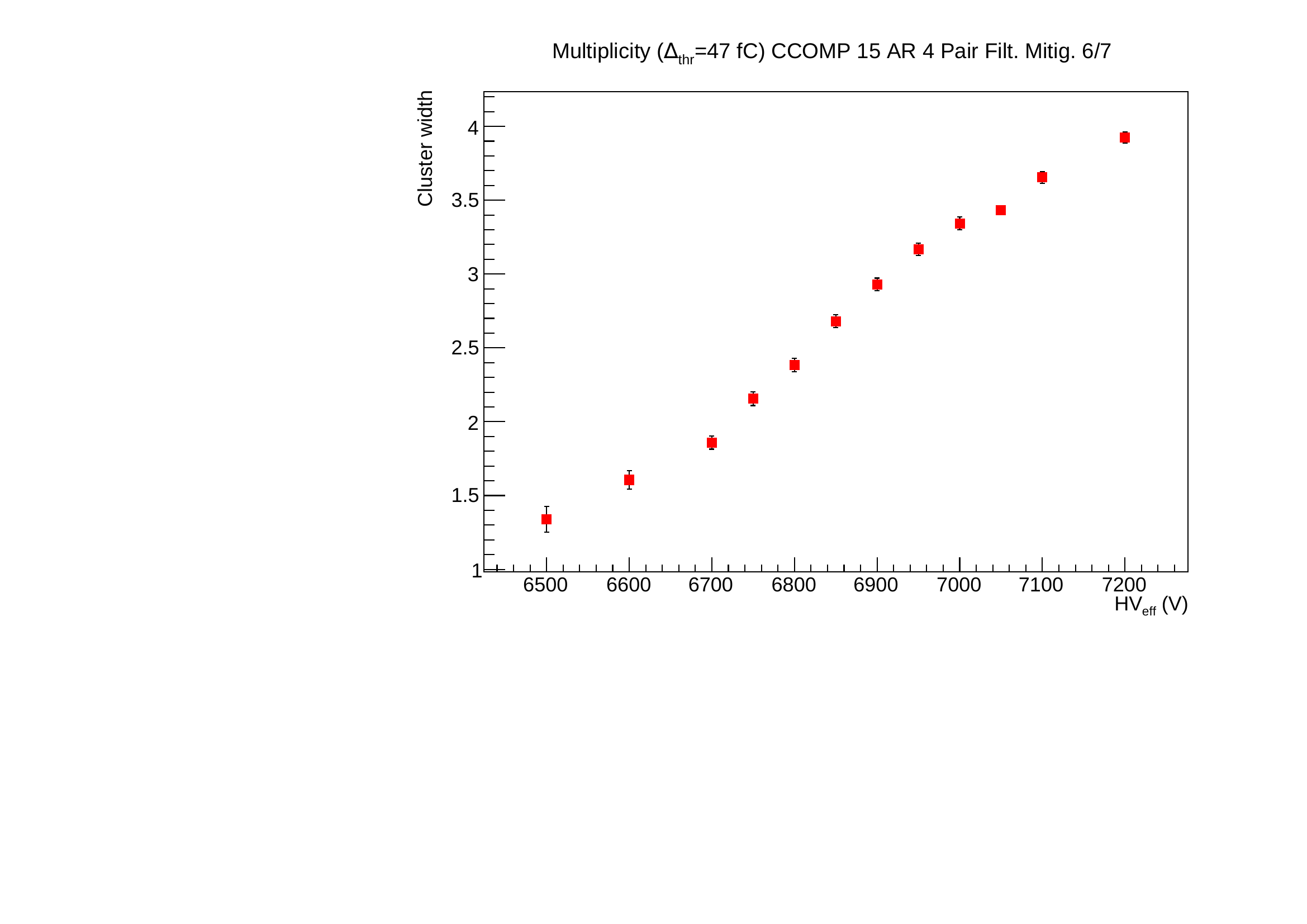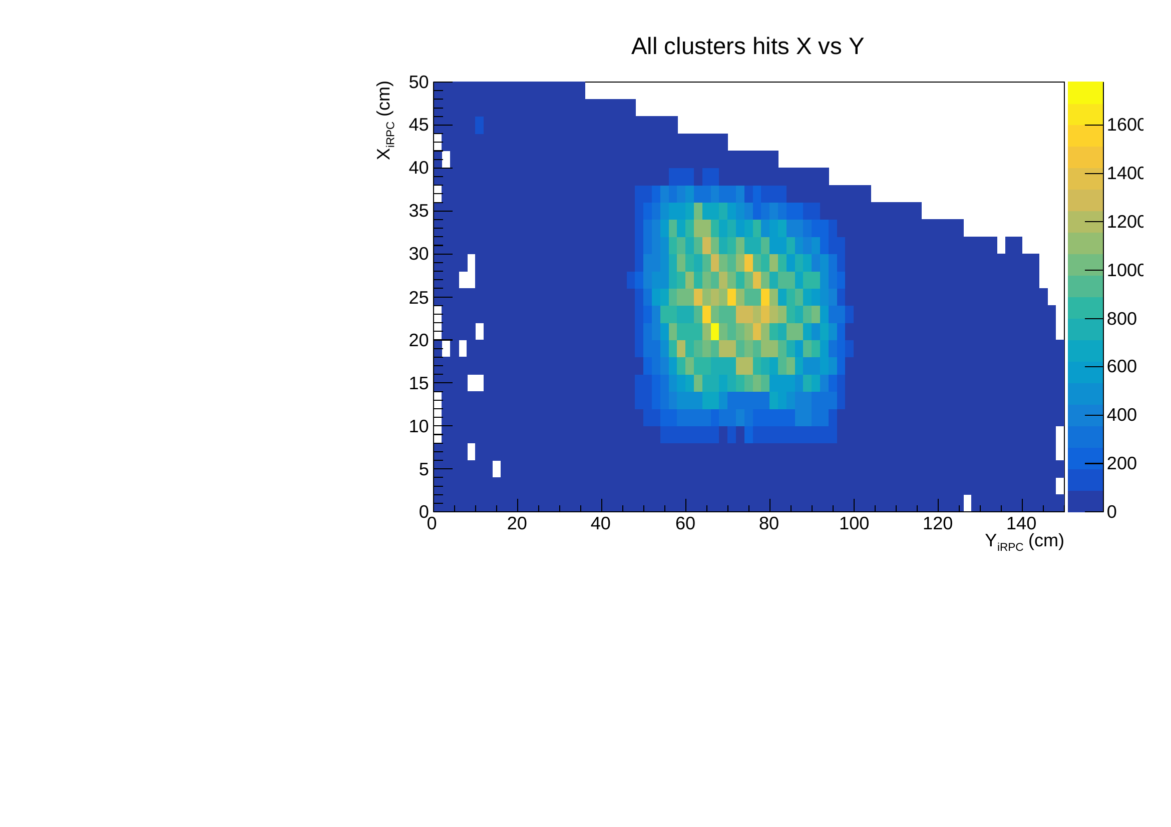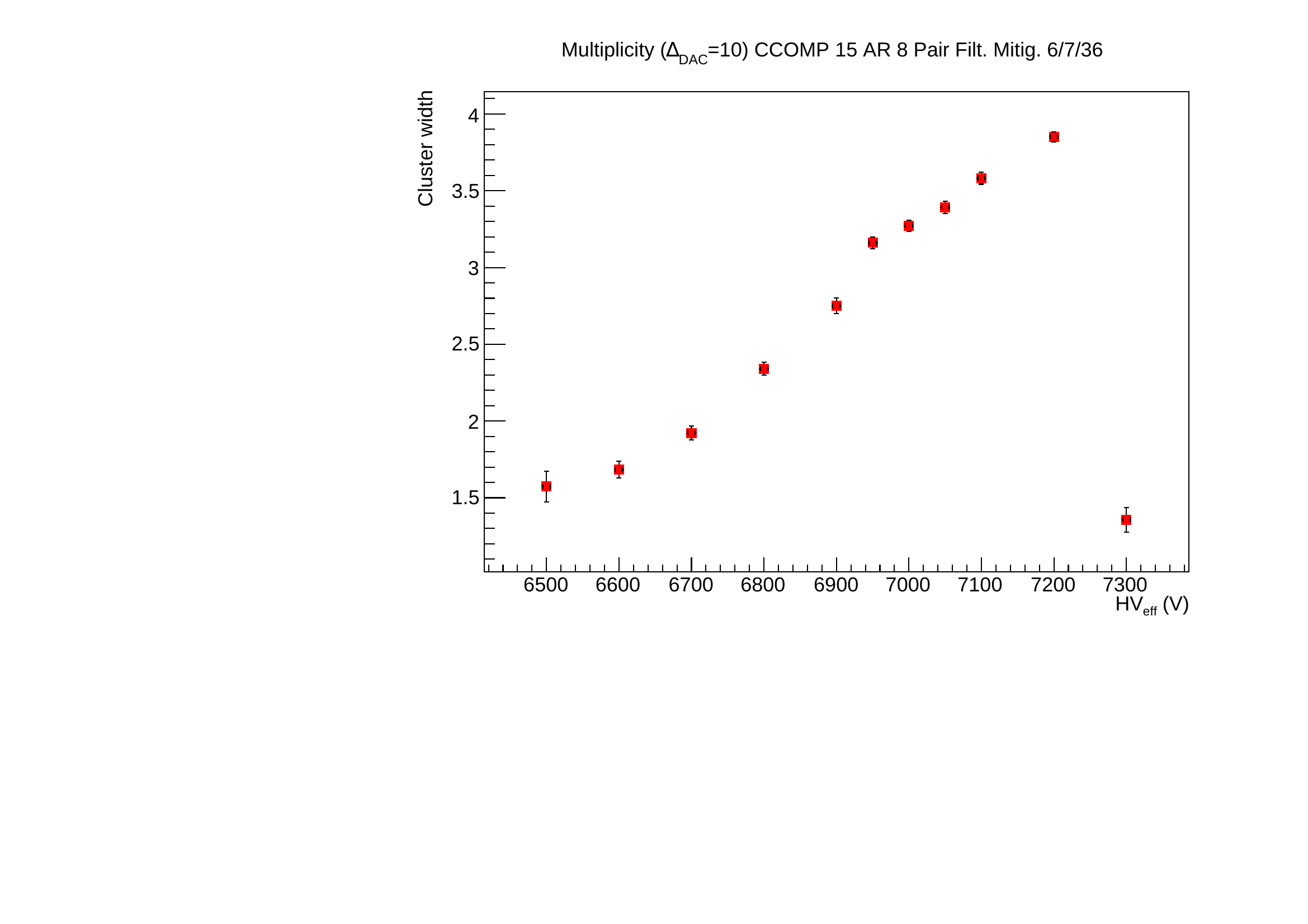 The HV was set at the estimated working point (7050 V, see bellow). We can measure the number of clusters reconstructed in a time window of 600 ns wide around the track pass through (figure