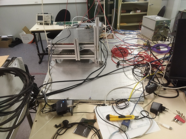 In order to repeat the measurements done at CERN we studied the performances using the coincidences of 2 scintillators around the chamber. The top one is 5x5 cm and the bottom one 10x20 cm. The tubes were positioned in parallel , perpendicular to the table where the chamber is positioned, crossing the strips.