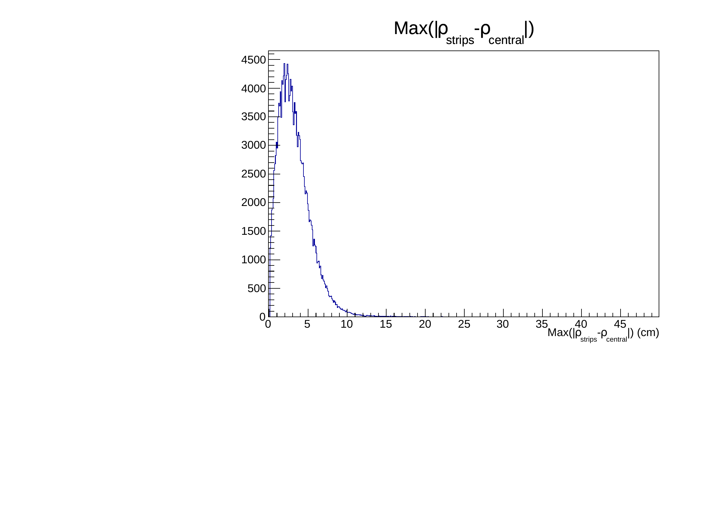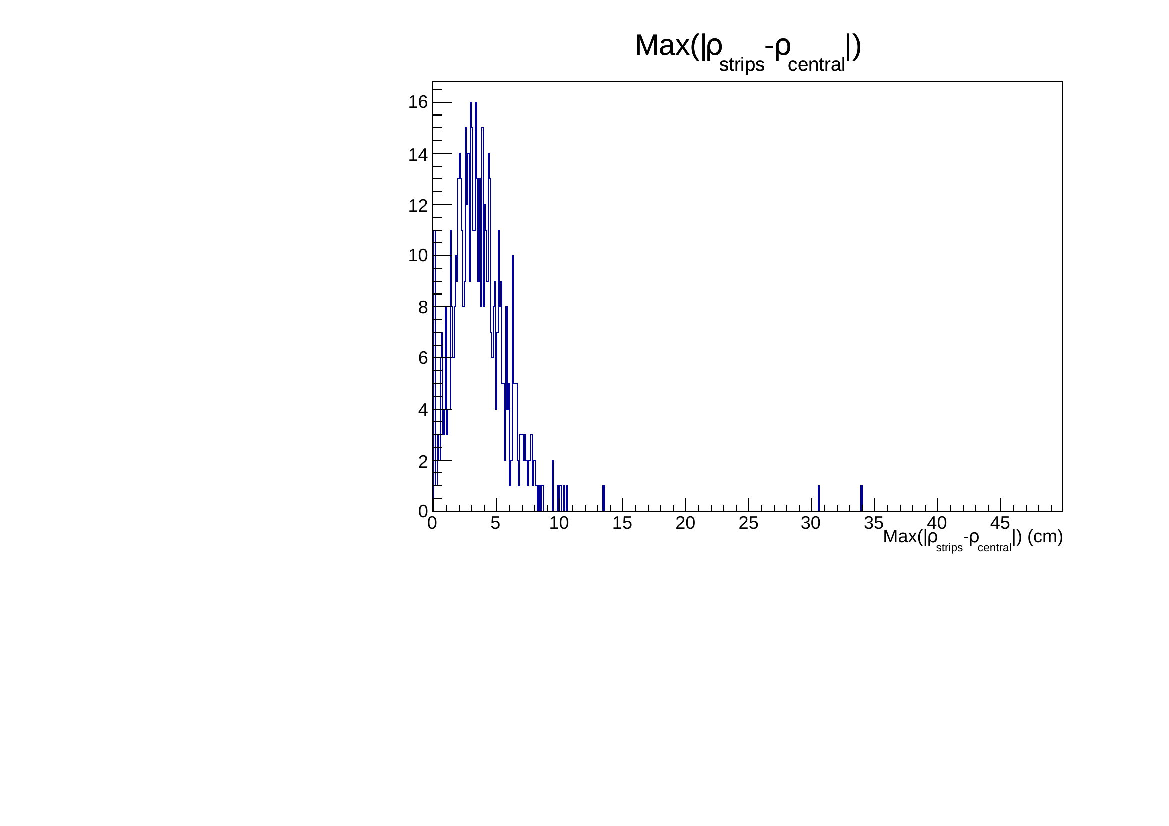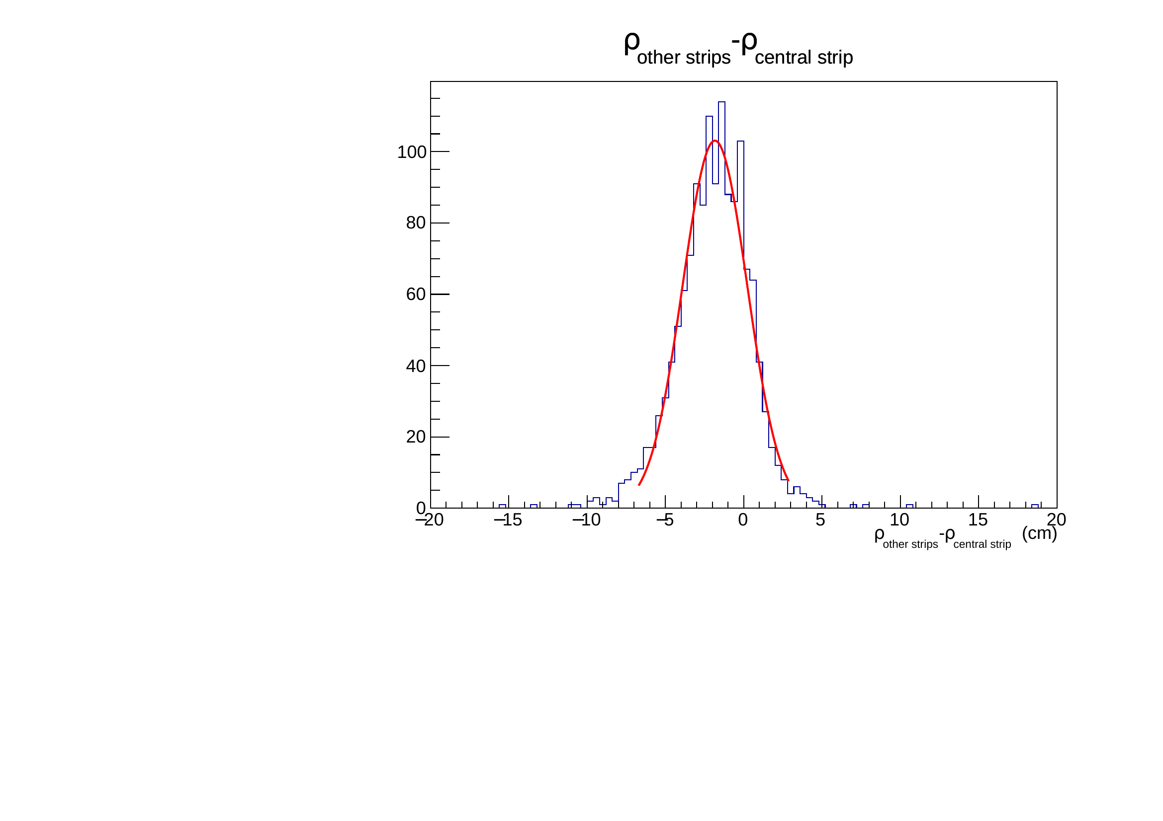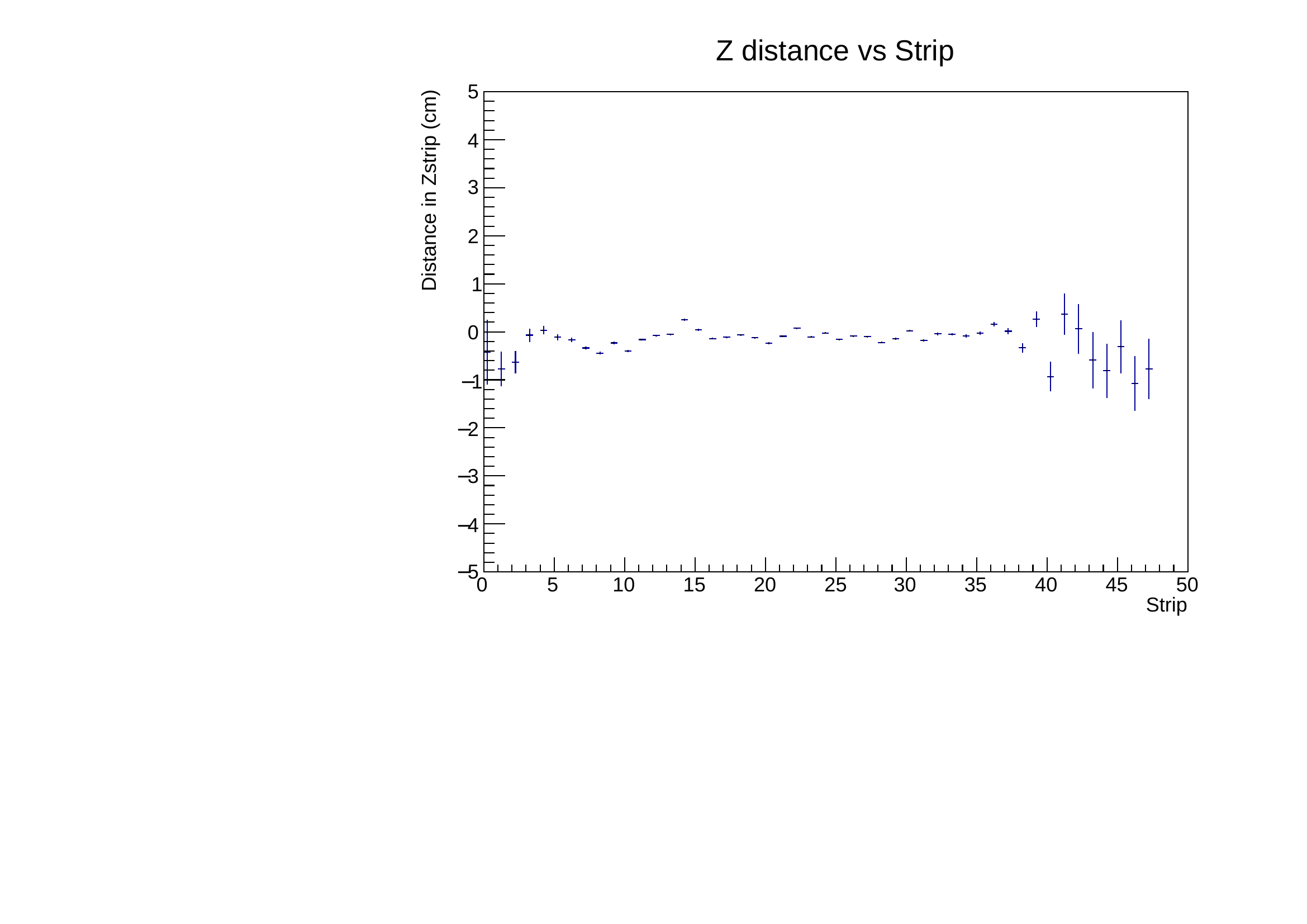 It is shifted from 0 and can extend up to 10 cm. This effect on side strips comes directly from the principle of the measurement. Lower signal on these strips will trigger later the discriminator, moreover depending on their position along the strip, the attenuation will vary. It is clearly seen on the following figures where the dependency is obvious both on maximum extension and on dispersion.