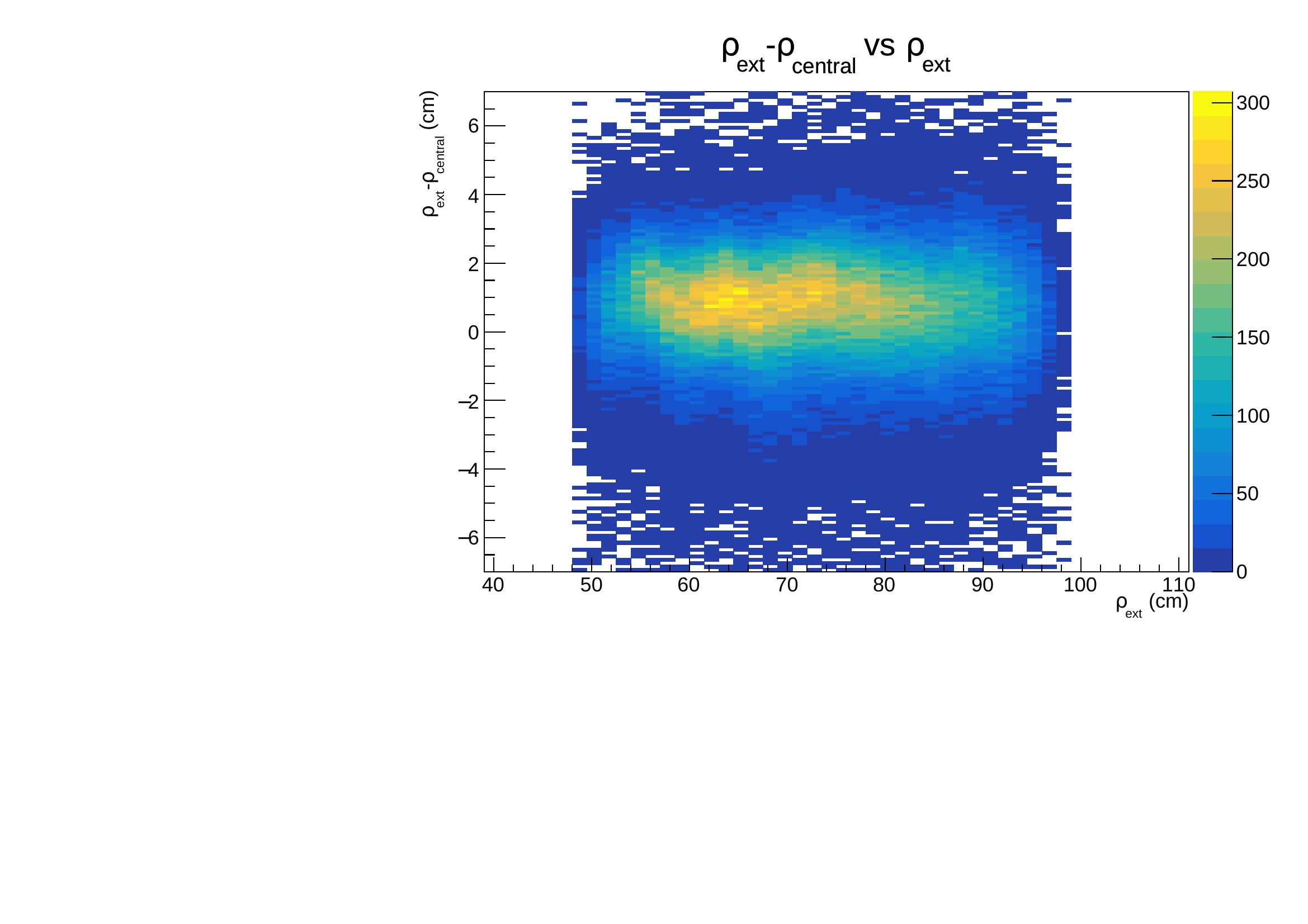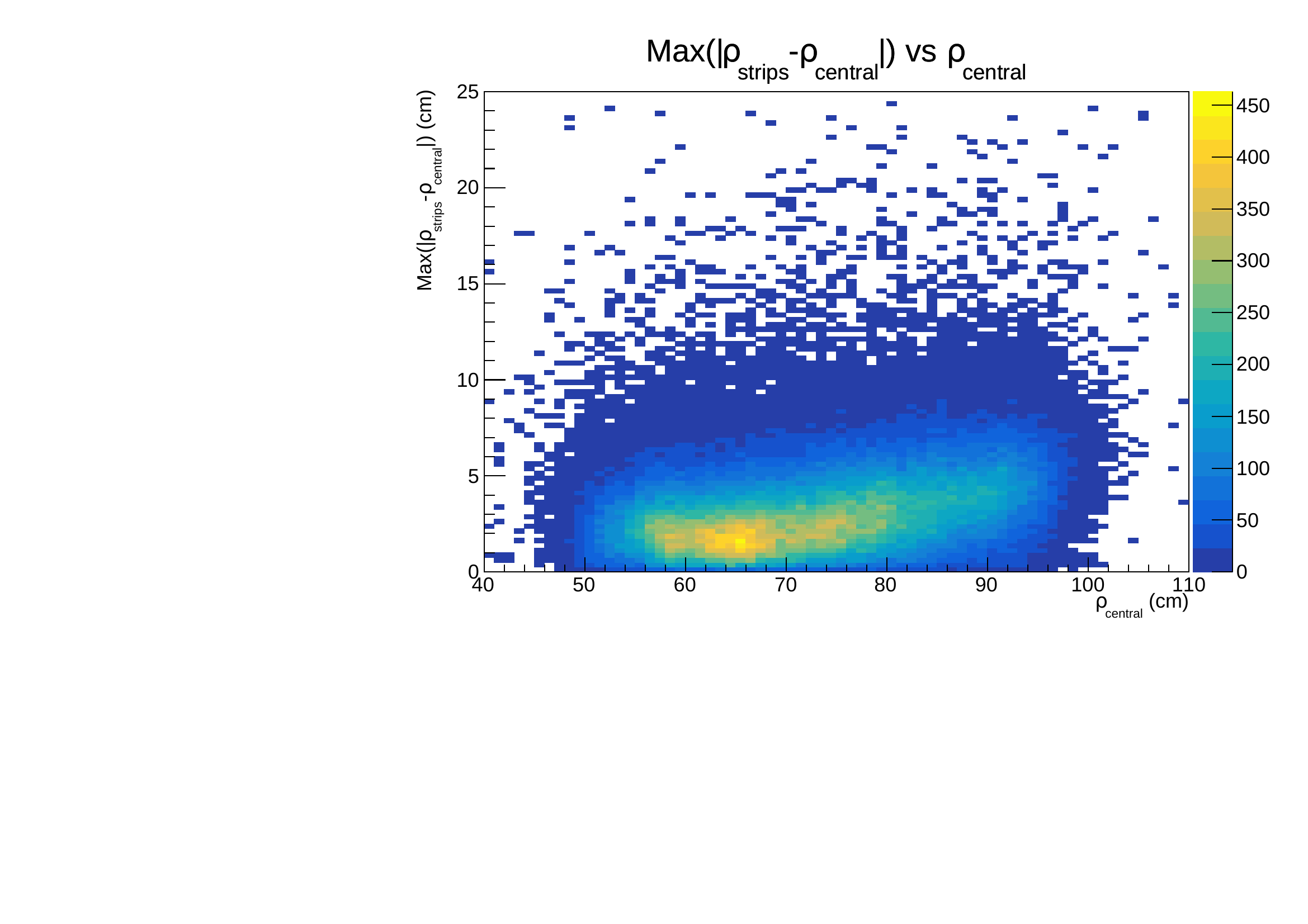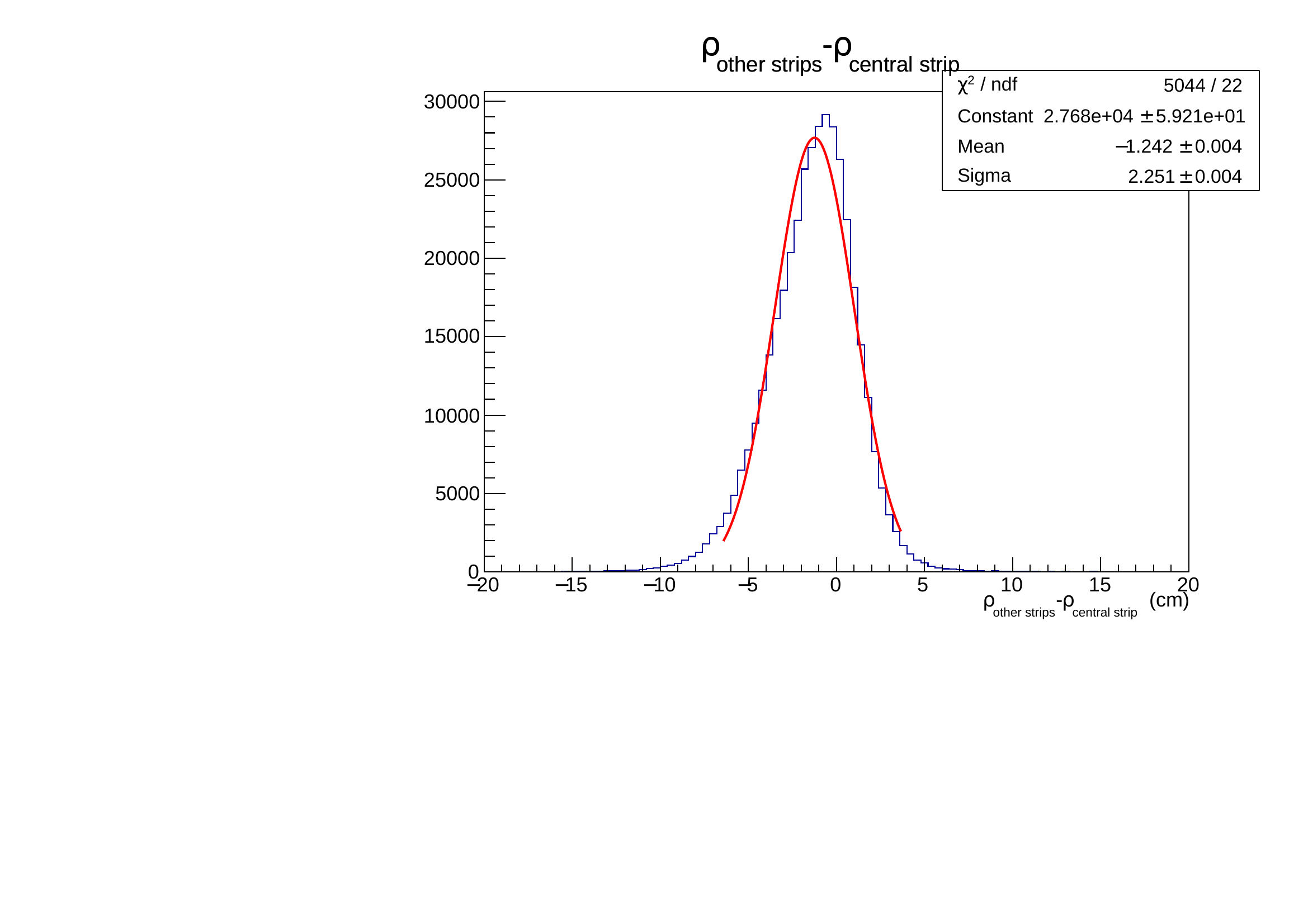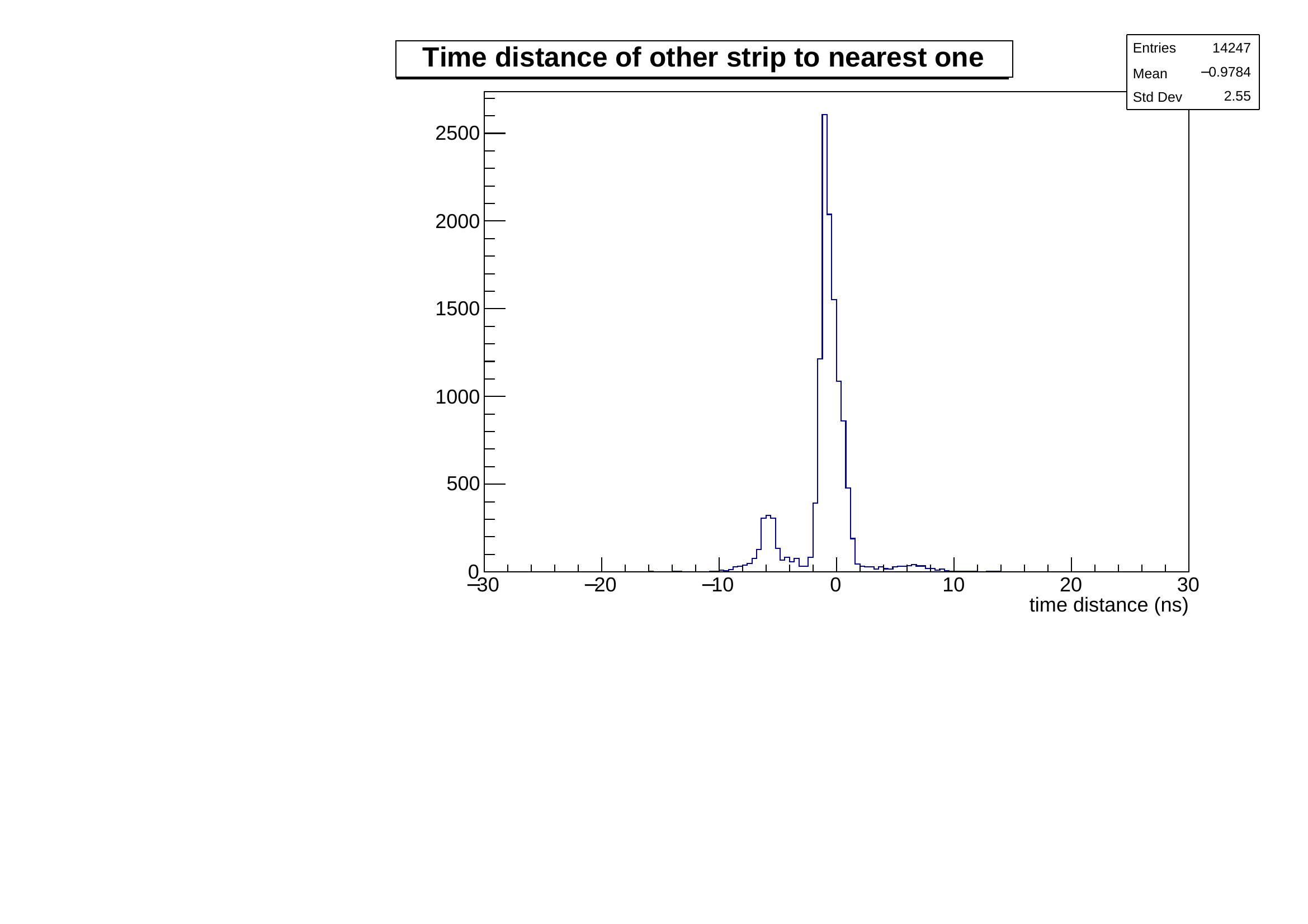 It is shifted from 0 and can extend up to 10 cm. This effect on side strips comes directly from the principle of the measurement. Lower signal on these strips will trigger later the discriminator, moreover depending on their position along the strip, the attenuation will vary. It is clearly seen on the following figures where the dependency is obvious both on maximum extension and on dispersion.