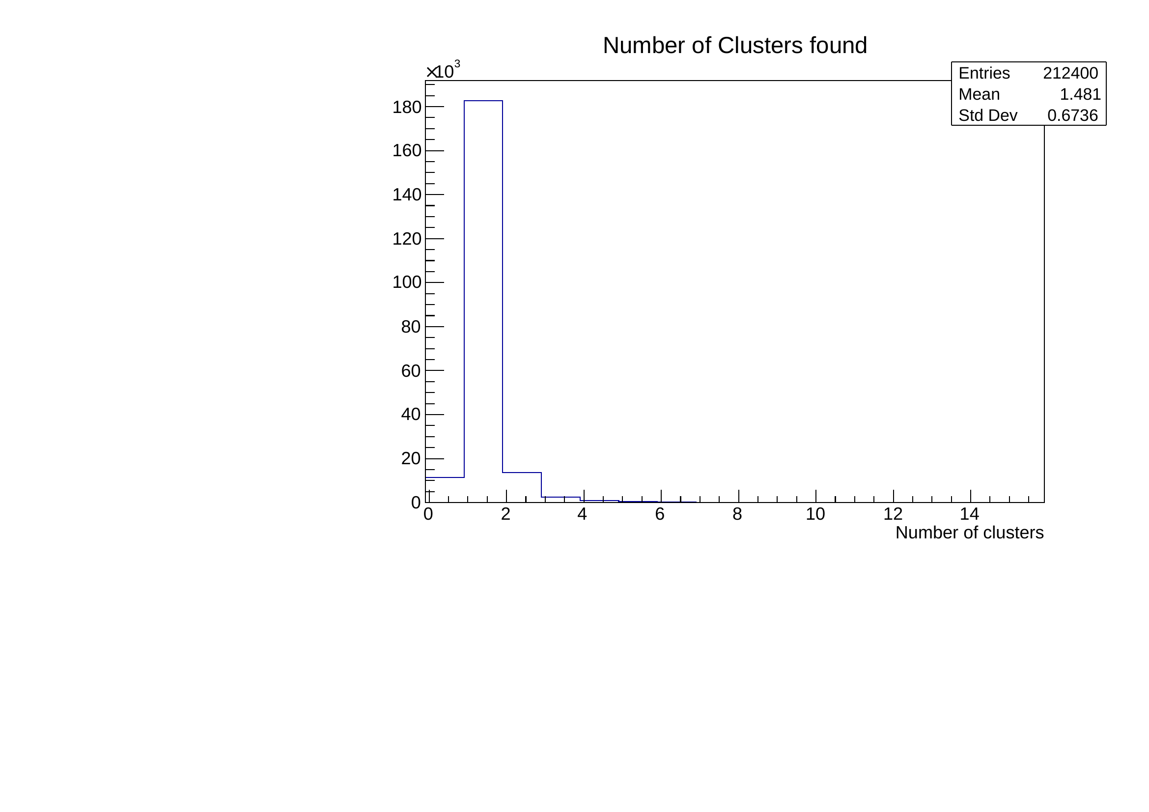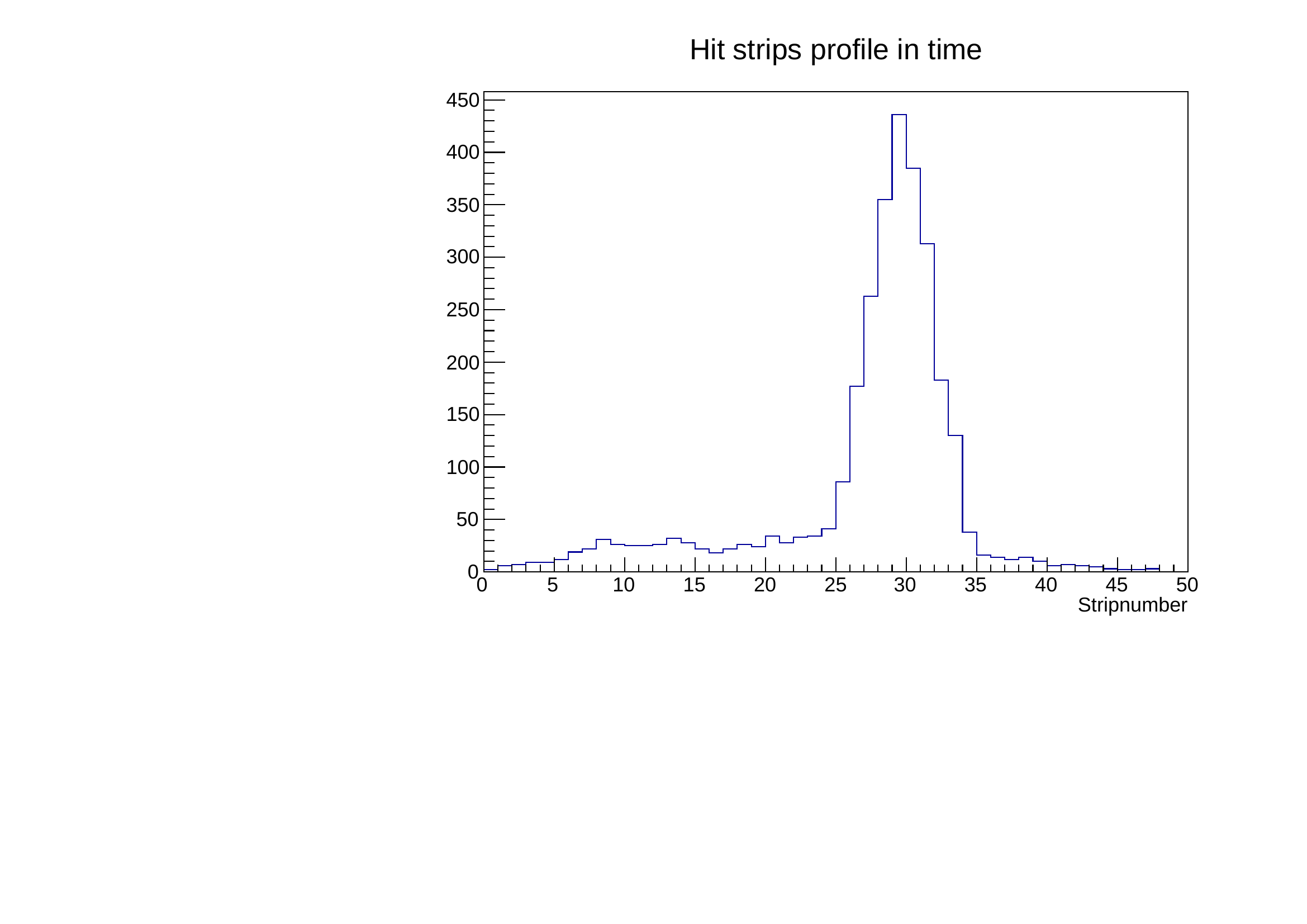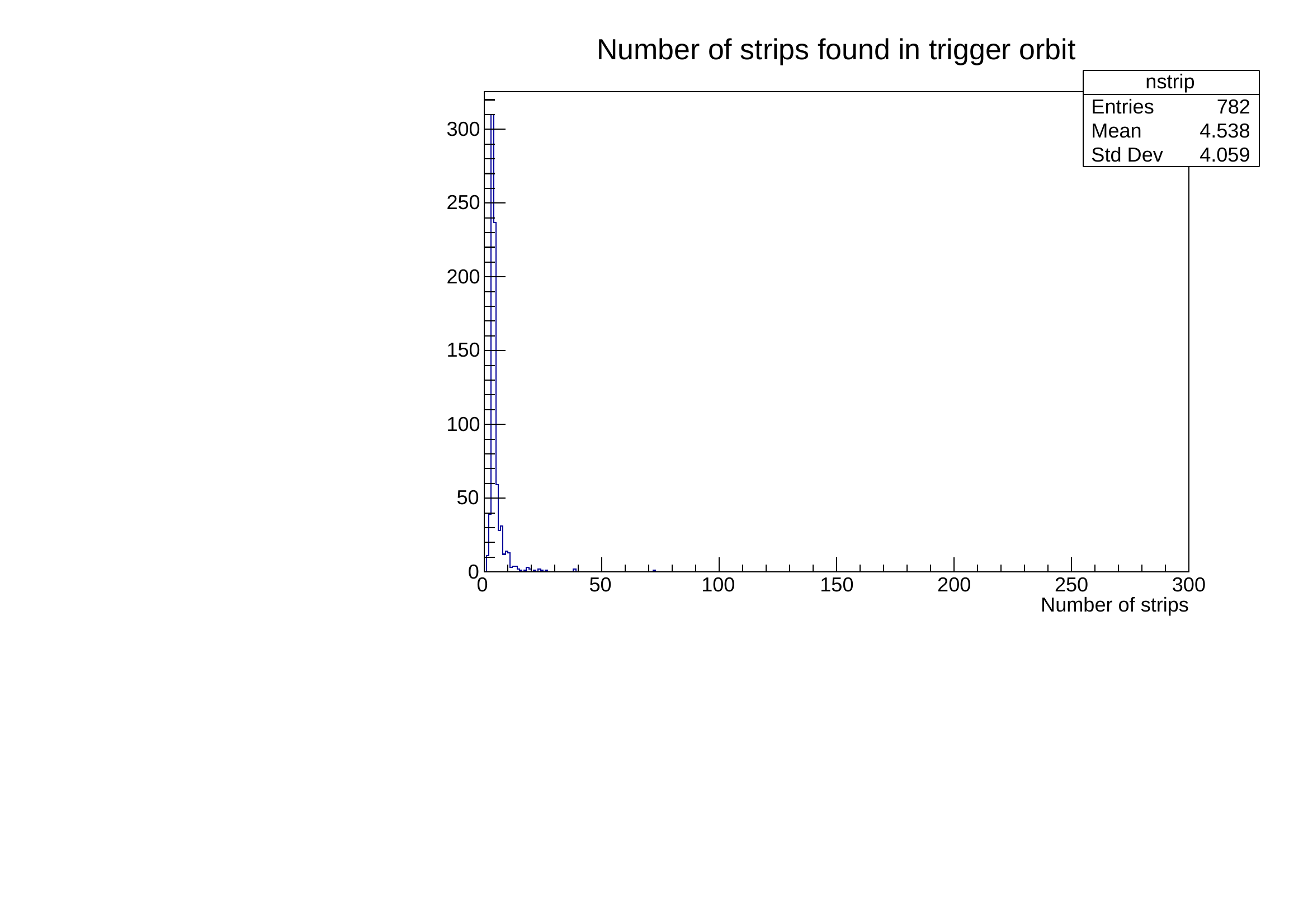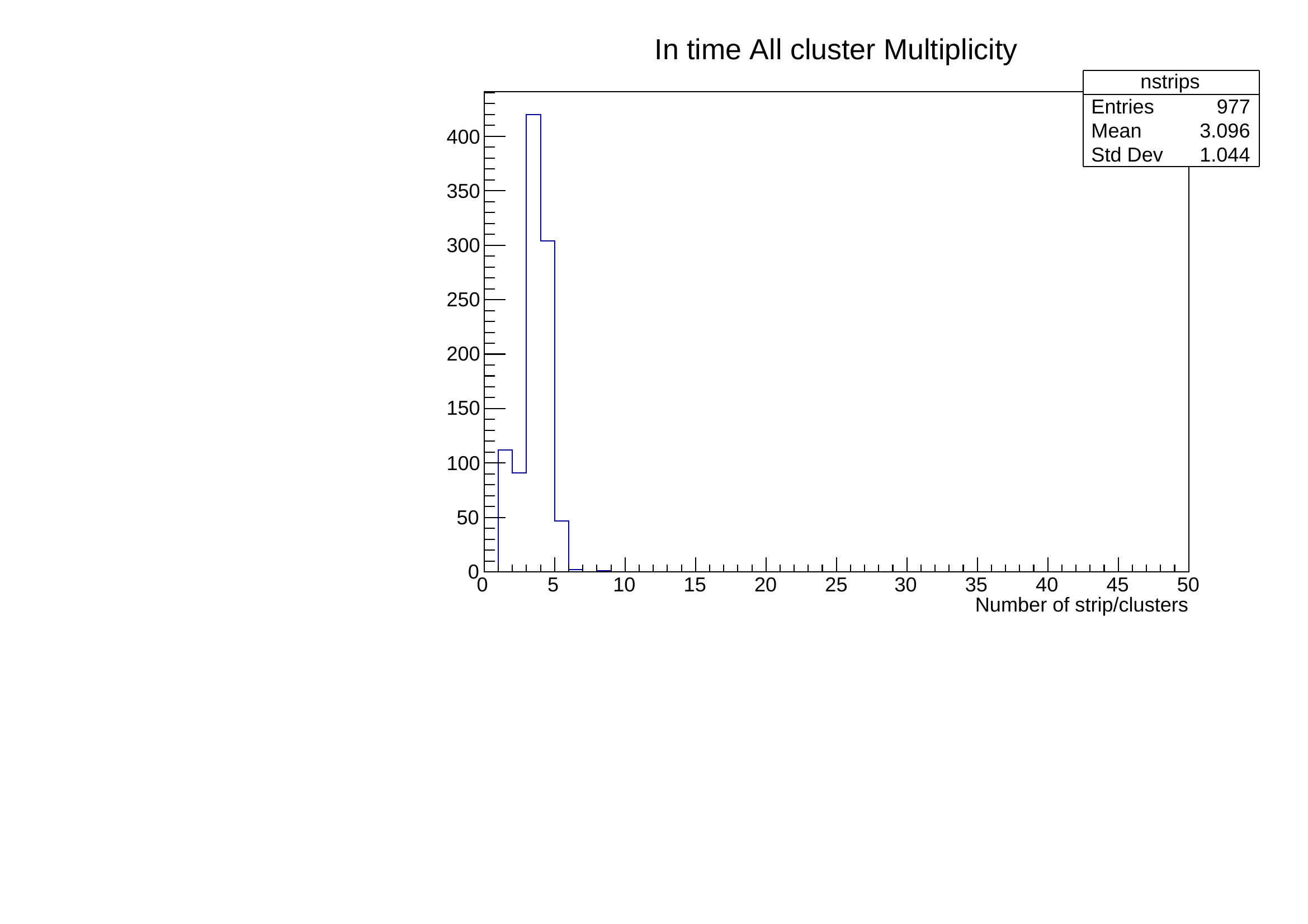 and this one the number of strip hits per cluster when only one cluster is found in the time window.