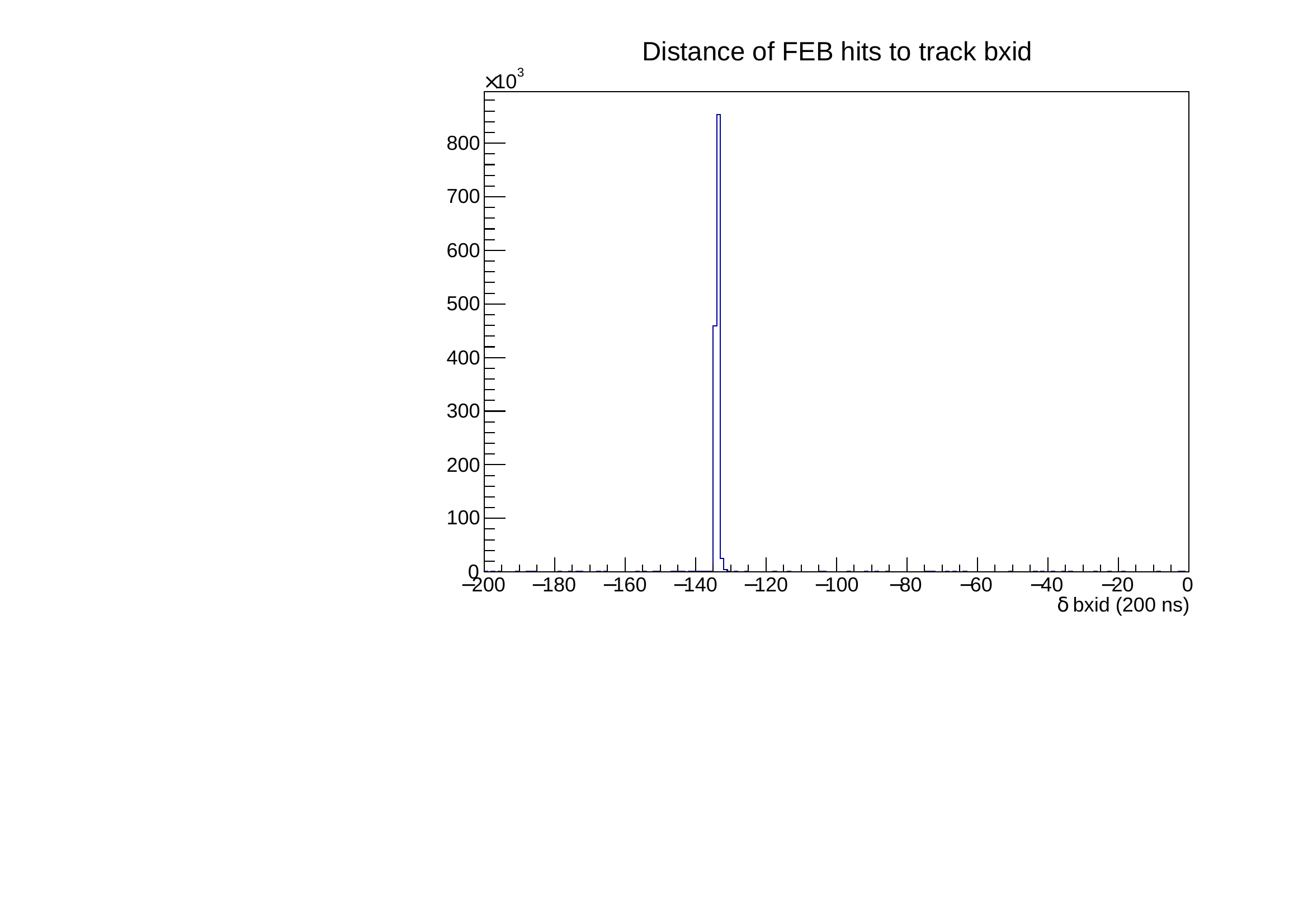 FEB data are associated if they match the bxid time of the track, taking into account the latency introduced by the FC7. The following figures shows the bxid distribution of FEB hits with respect to the track. Coincidence hits extend on 3 bxid maximal. One can also notice that the level of noise hit is negligible.